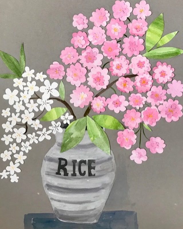 I’ve been making collages on and off for about five years and the technique particularly lends itself to spring blossom. I enjoy the absorption of snipping, sticking and painting. The perfect antidote to worrying about World War III.